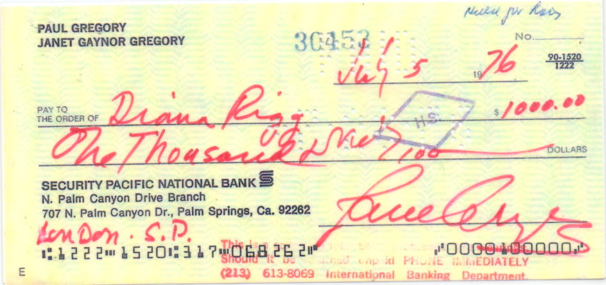 Dazu kommt ein Scheck der Stummfilmlegende JANET GAYNOR aus 1976, der von DIANA RIGG rückseitig gegen gezeichnet wurde. Der Scheck ist eine in Folie eingeschweißte Originalkopie).