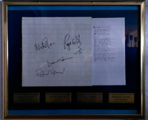IM KUNDENAUFTRAG: PINK FLOYD Autogramme von DAVID GILMOUR, RICHARD WRIGHT (+ 2008), ROGER WATERS und NICK MASON signiertes LP-Cover von THE WALL