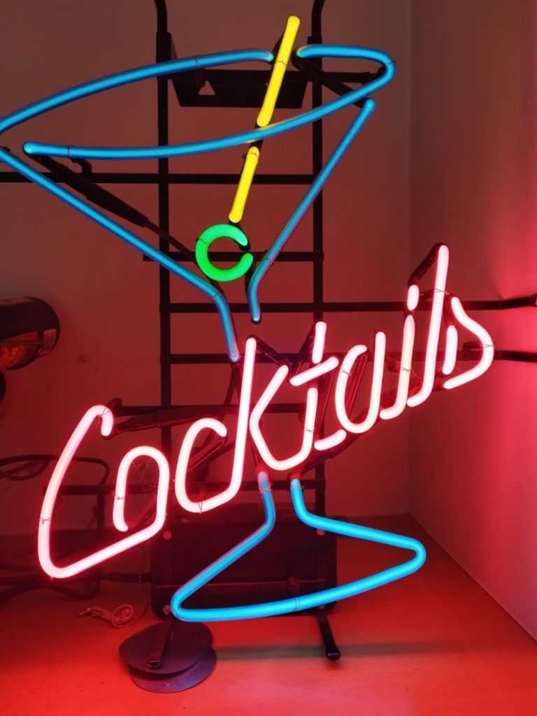 Besonders beliebt sind diese Neonschriften mit „Cocktails“, die eine nostalgische 80er-Jahre-Atmosphäre schaffen und Gäste anziehen.