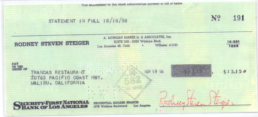 Original signierte Karteikarte des charismatischen Filmstars. In-Person erhalten. Inklusive Bankscheck von 1958 (eingeschweißte Originalkopie) zum Kombinieren als prachtvolle Memorabilie in Passepartout und Rahmen.